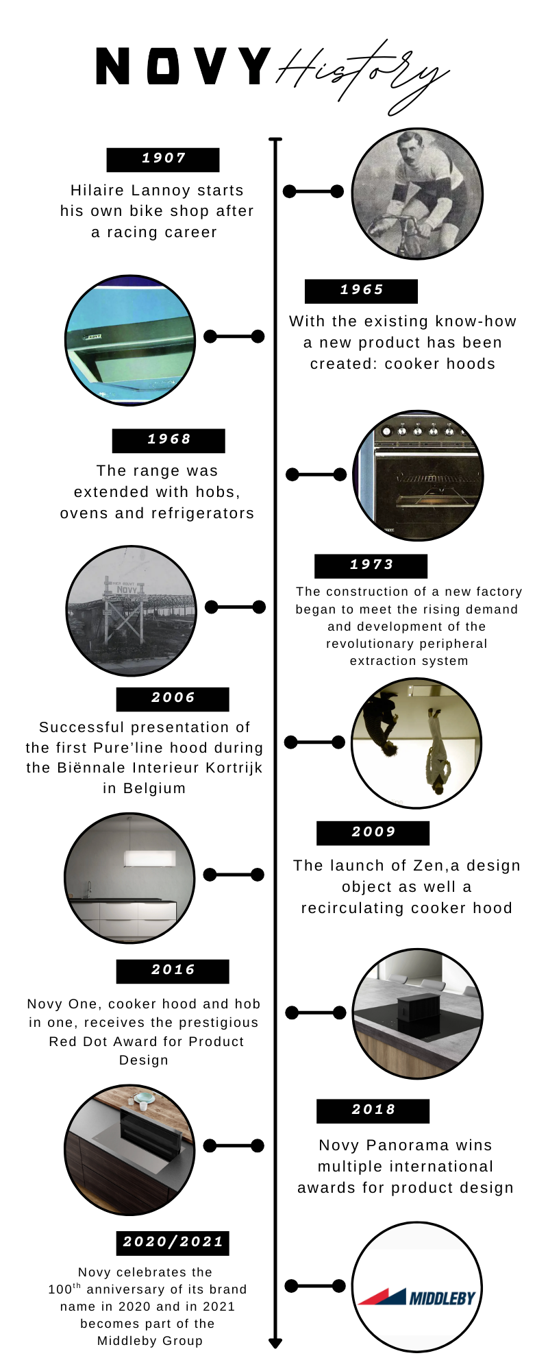 Novy was founded in Belgium in 1907 by cyclist Hilaire Lannoy, evolving from a bicycle and motorcycle company into a leading European specialist in premium kitchen ventilation and hobs. In 1965, Novy entered the cooker hood market, as fitted kitchens became more common across Europe. In the 1970s and 1980s, Novy responded by developing built-in cooker hoods designed to sit discreetly within cabinetry.