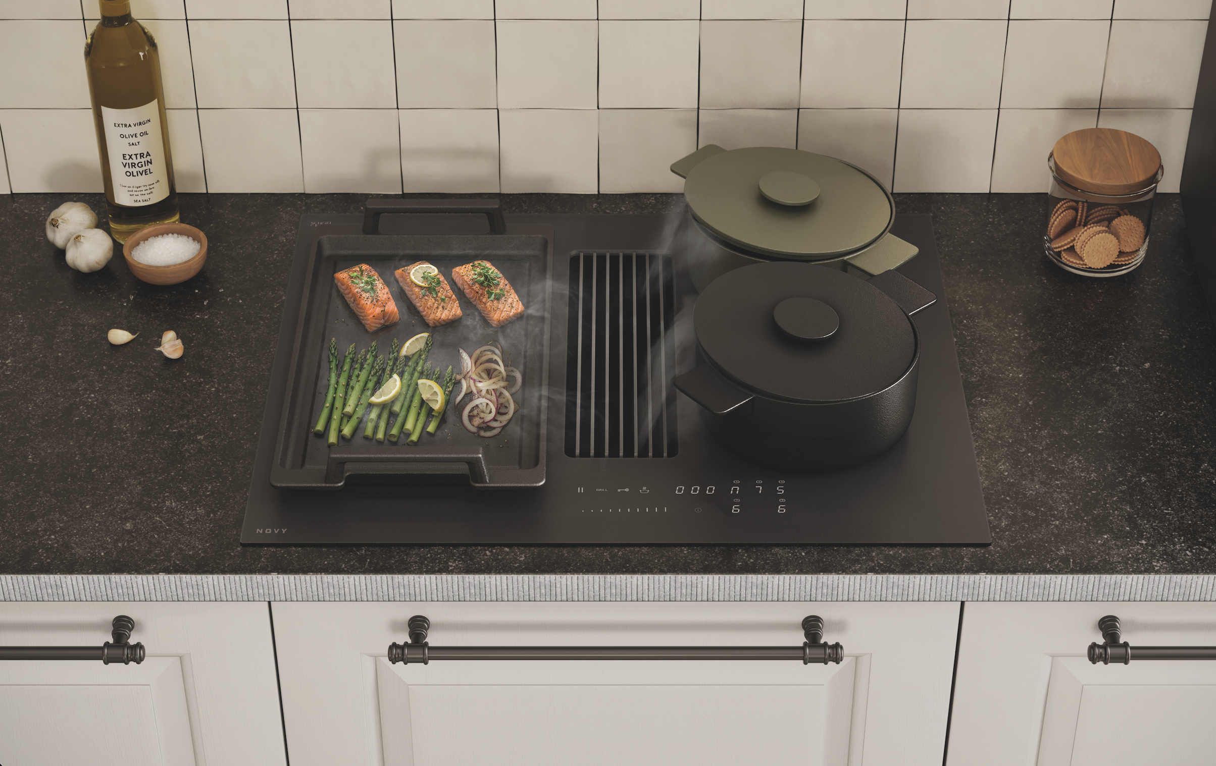 The Novy Up combines a modular hob with an integrated extractor. The flexibility of the Novy Up lets you design your hob exactly the way you like, with a choice of various cooking setups. Additional hob elements can be added to give you even more cooking zones, with the extraction tower disappearing between domino hobs.