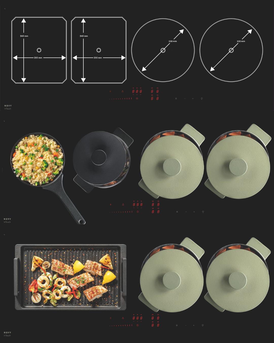 The Novy Pro range offers total cooking freedom thanks to ultimate flexibility and smart technology. These are high-performing induction hobs with extendible flex zones and numerous extra features, giving flexible cooking at its best.
