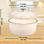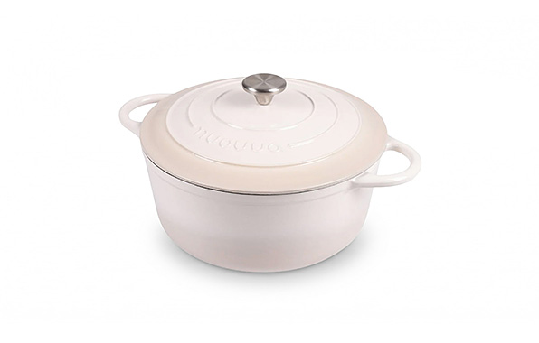 The Nuovva 28cm (6L) ivory cast iron Dutch oven is a round casserole pot designed for use on the hob and in the oven. Made from enamel-coated cast iron, it provides consistent heat retention for cooking methods such as roasting, stewing and baking. The enamel interior creates a non-stick surface that does not require seasoning and supports easy cleaning.  With a 6-litre capacity, it is suitable for preparing larger portions and is compatible with gas, electric and induction hobs.