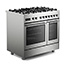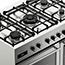 The hob is equipped with five gas burners, including a powerful double-ring wok burner for high-heat cooking, supported by durable cast-iron pan supports. The seamless hob surface is easy to clean, while the professional finish is available in stainless steel with chrome effect controls.