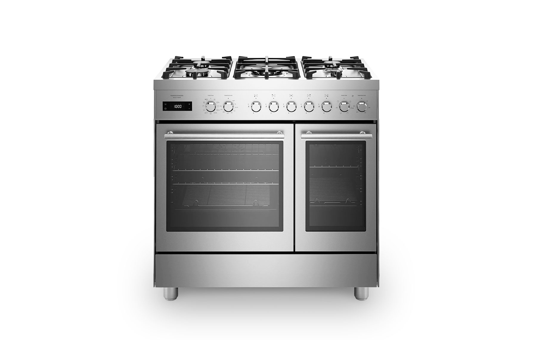 The Select 90df2 is a stylish twin-cavity dual-fuel range cooker finished in stainless steel. The main 74-litre oven (40–250°C) features 11 cooking functions, including fanned, conventional, grilling, and an easy steam cooking function for healthier, evenly cooked results. Practical features such as a touch control digital programmer and fast preheating support everyday cooking, while steam-assisted cleaning and an easy-clean enamel interior make maintenance simple and convenient.