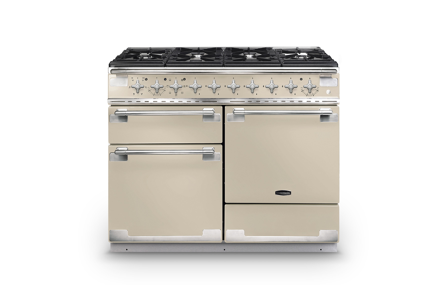 The elegant facia features geometrically designed, solid metal control knobs with a brushed chrome finish. A multifunction main oven (with integrated grill) and fanned second oven are complemented by a separate glide-out grill and a storage drawer.