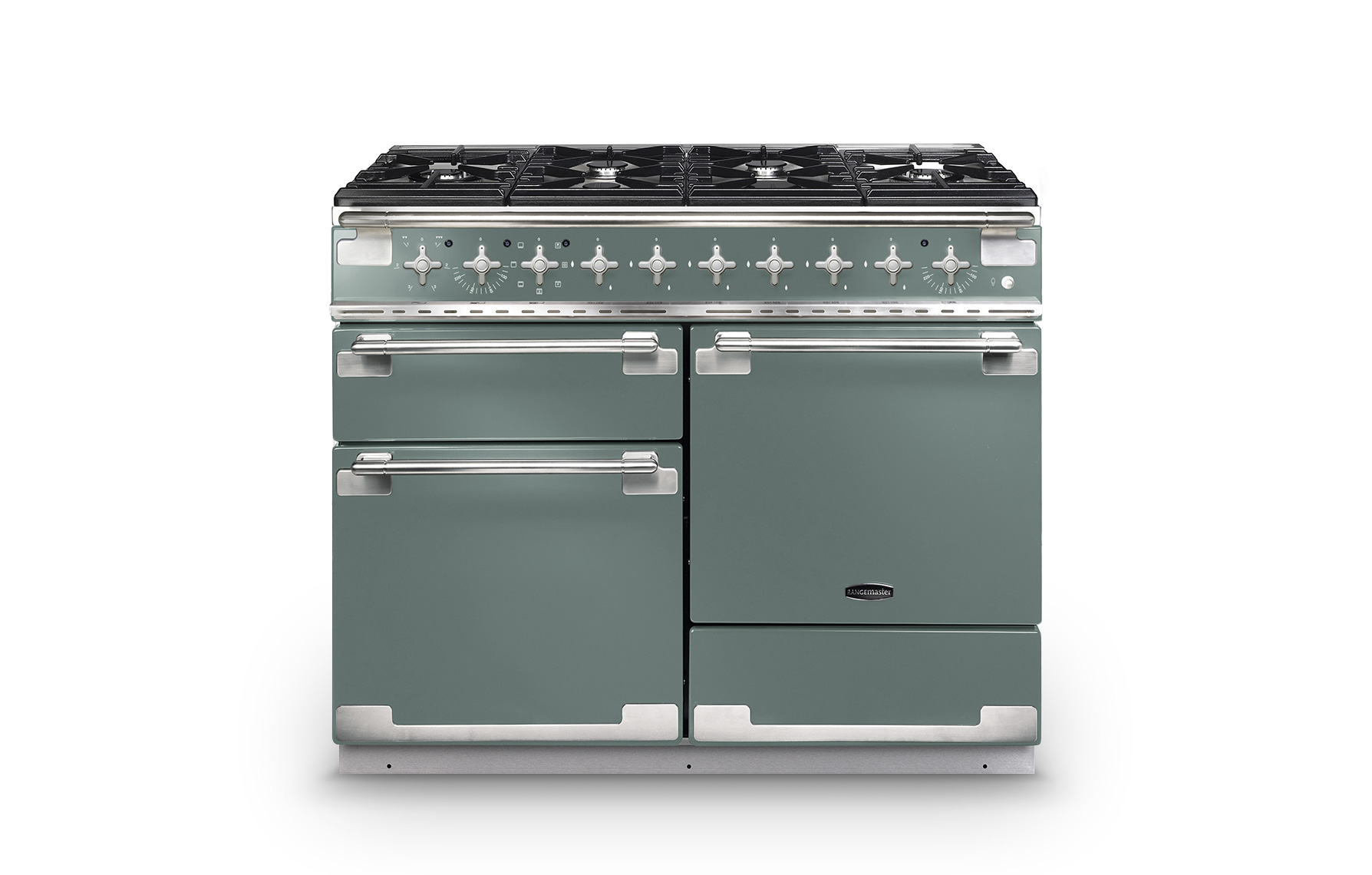 The elegant facia features geometrically designed, solid metal control knobs with a brushed chrome finish. A multifunction main oven (with integrated grill) and fanned second oven are complemented by a separate glide-out grill and a storage drawer.