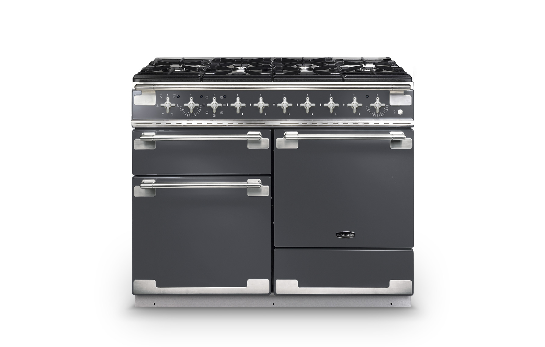 The elegant facia features geometrically designed, solid metal control knobs with a brushed chrome finish. A multifunction main oven (with integrated grill) and fanned second oven are complemented by a separate glide-out grill and a storage drawer.