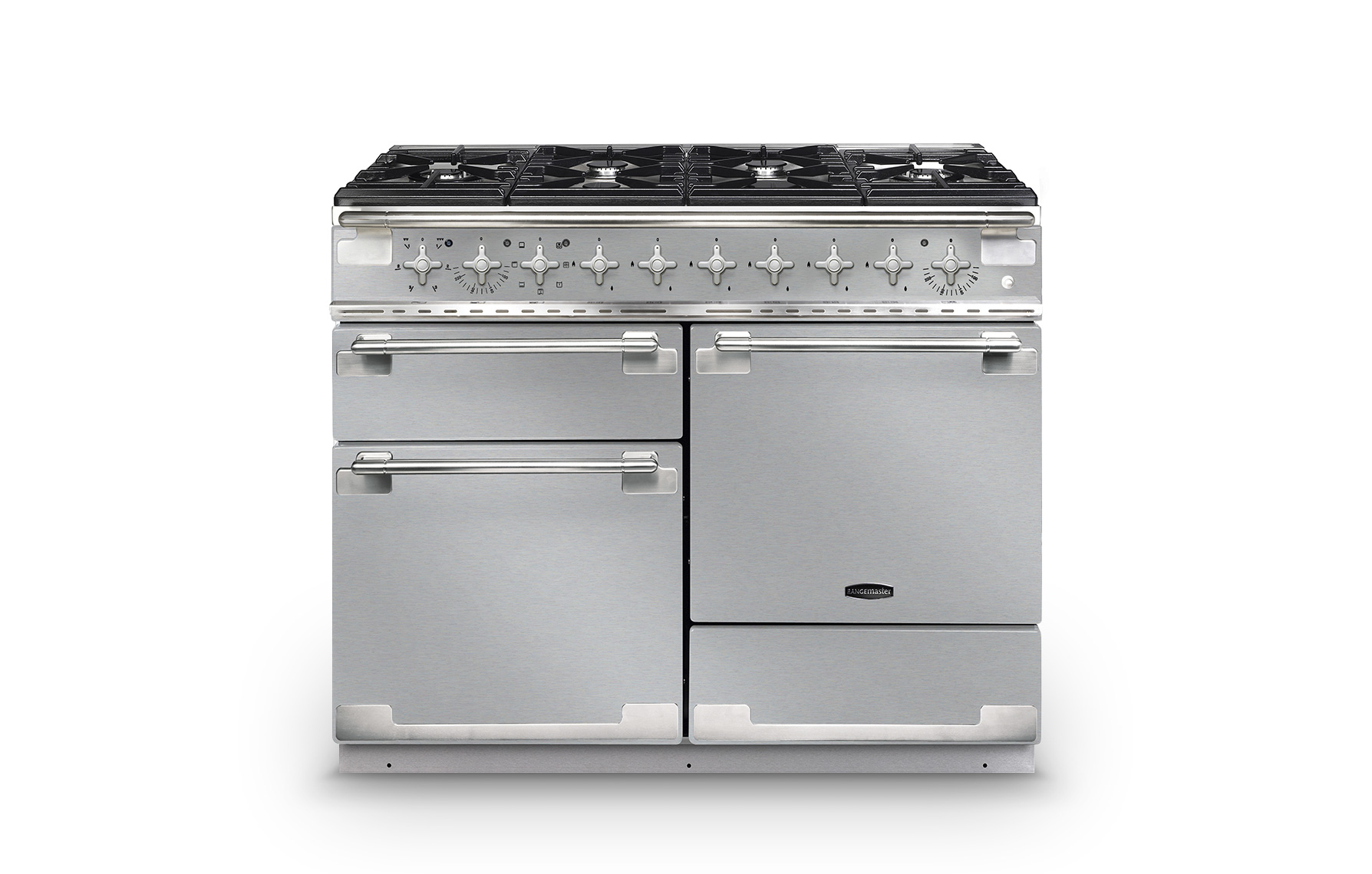 The elegant facia features geometrically designed, solid metal control knobs with a brushed chrome finish. A multifunction main oven (with integrated grill) and fanned second oven are complemented by a separate glide-out grill and a storage drawer.