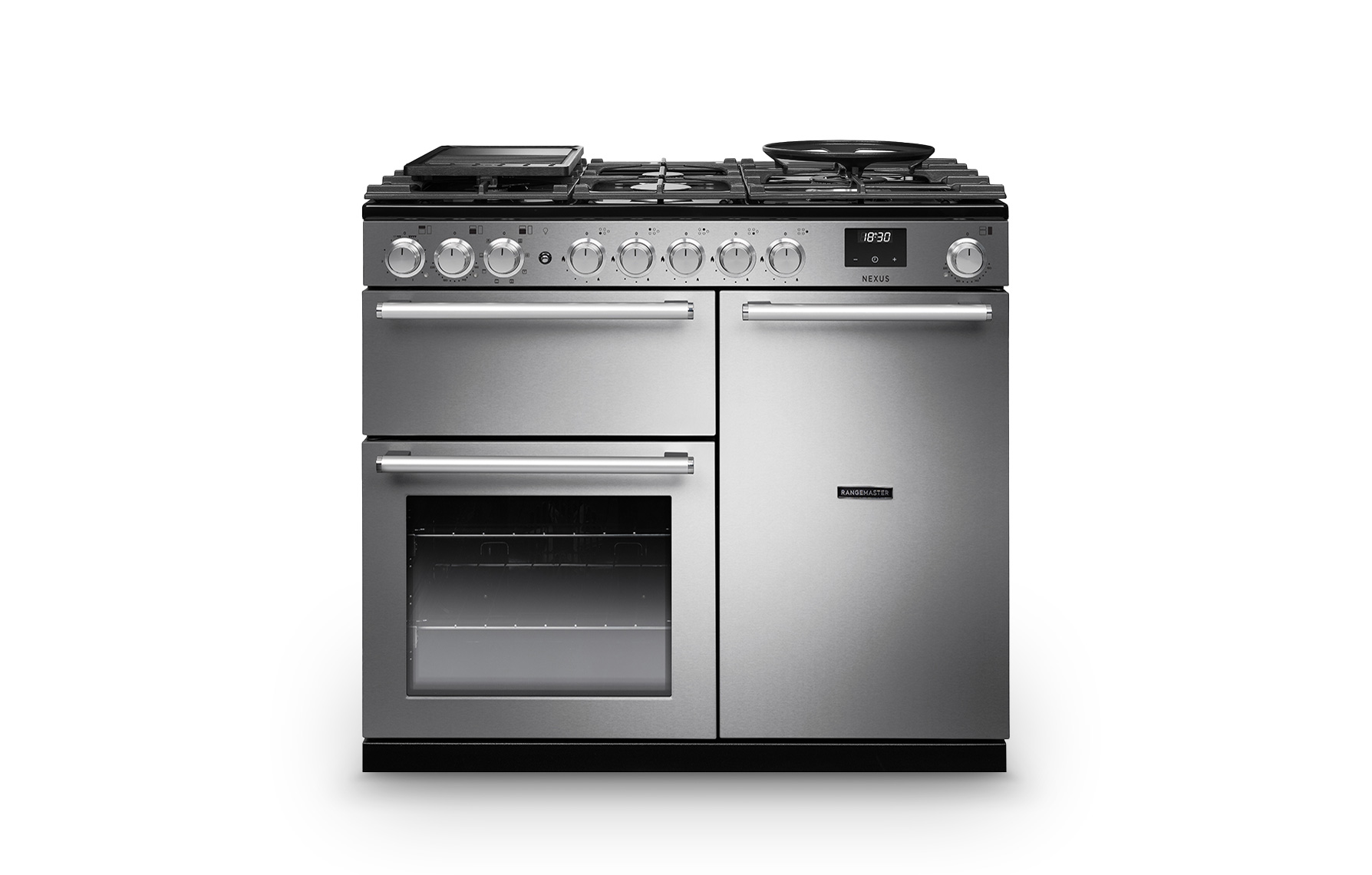 The Rangemaster Nexus 100 combines a clean, contemporary design with chrome accents and distinctive knurled rotary controls, all complemented by a white LED touch display.